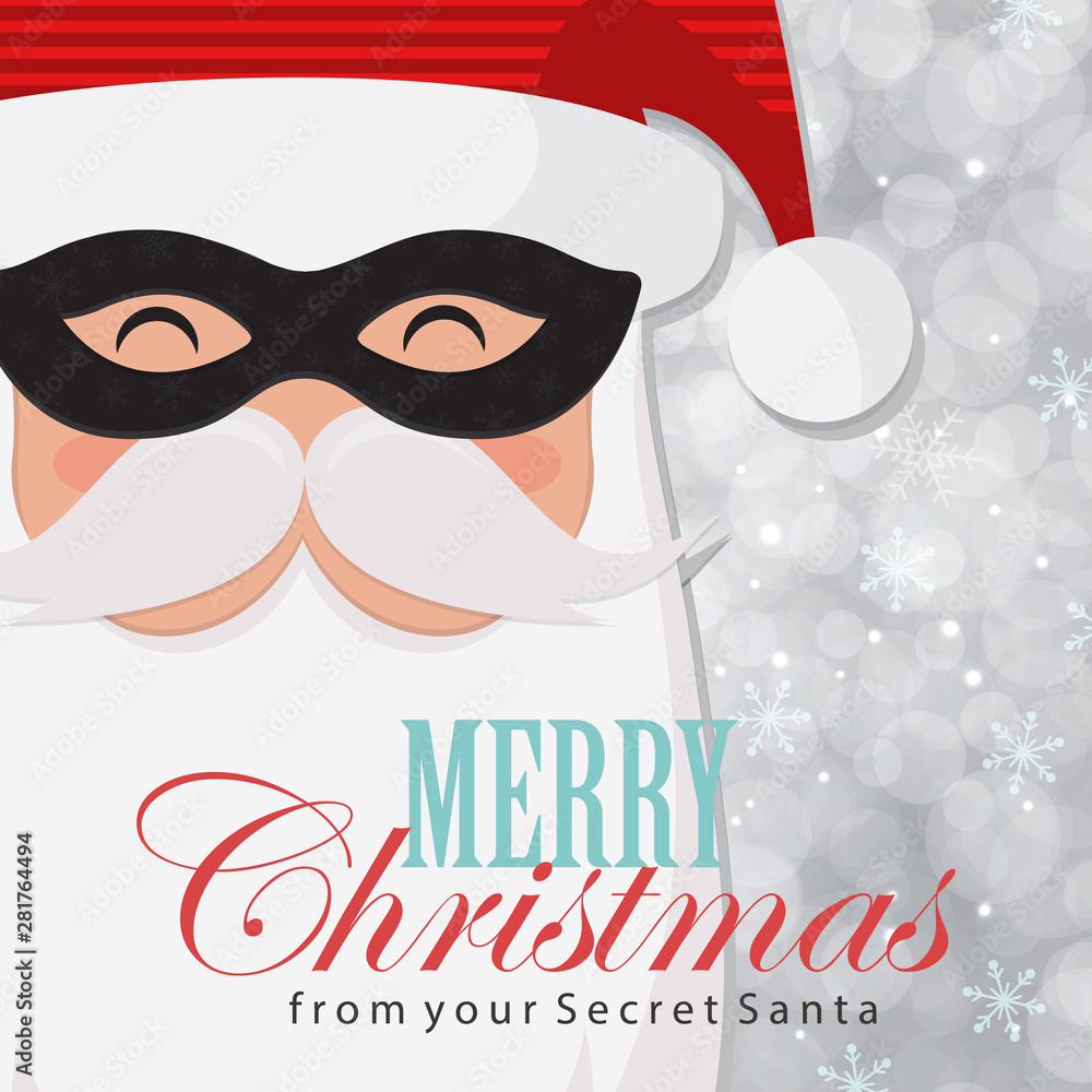 Merry Christmas greeting card with Secret Santa and holiday decor